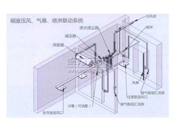 氣幕噴淋系統(tǒng)是煤礦井下避難硐室或救生艙的重要組成部分,是將壓縮空氣通過噴氣氣幕管形成氣幕,在避難硐室防護密閉門處形成一個相對隔絕的密閉室,過渡室上部的噴淋設(shè)備釋放大量的氣流,單向換氣閥將有毒氣體替換出去,不會隨著避險人員進入到生存室內(nèi)。