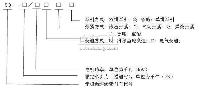 額定牽引力為90kN、電機功率為75kw、齒輪變速、重錘張緊無極繩連續牽引車表示為:SQ-90/75B。