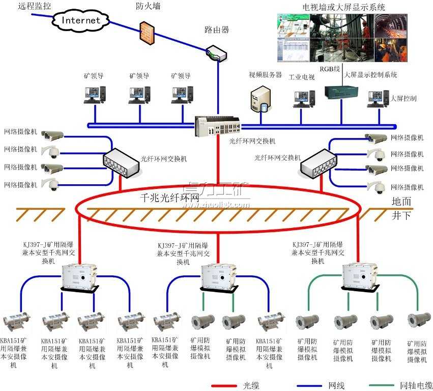 工業電視監控系統以地面千兆光纖環網交換機和井下KJ397-J礦用隔爆兼本安型千兆網交換機為核心,組成地面與井下一體的千兆光纖環網,每個交換機上有多個100M以太網電口,網絡攝像機可以通過網線直接接入交換機,由光纖環網傳輸到地面監控中心。此外,礦用交換機內部設有視頻服務器,井下模擬攝像機可以直接通過同軸電纜接入。