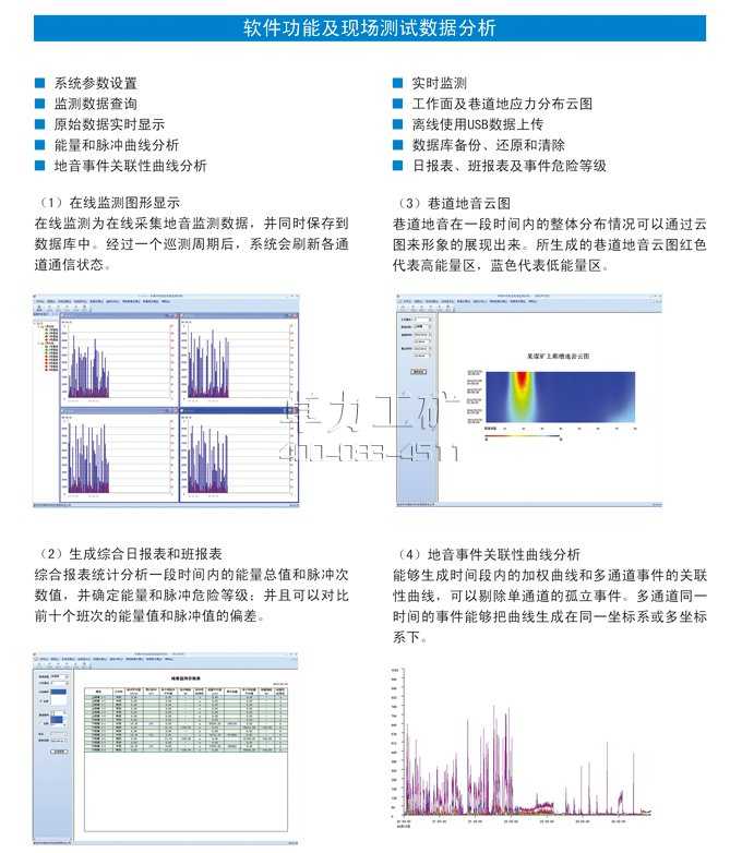 基本功能:在煤礦開采中,煤巖體彈性變形能的瞬時釋放而產生突然劇烈破壞的動力現象稱為“沖擊地壓”或“沖擊礦壓”。采場沖擊地壓已成為引發煤礦地質災害的重要因素之一。沖擊地壓發生是一個能量漸變到突變的過程,即煤巖體從微小破裂到破壞的過程,這個過程中伴隨著能量的釋放引起的彈性波向外傳播(即地音)的過程。本系統通過監測地音事件參數指標的變化,用以確定監測范圍內煤巖體的應力狀態。監測分析軟件(SCMPS)以圖表的形式顯示地音事件的能量、頻度,并做各種分析運算工作,得出班累計地音事件數、班累計能量、平均能量、生成報表打印。通過對監測數據的綜合分析,可以獲取采場動力災害的前兆信息,對采場動力災害進行預測預報。目前國內應用的地音監測系統大多數都是引進國外的,如波蘭的SAK系統、ARES-5/E監測系統,由于成本、服務等因素影響在推廣方面受到了限制。該系統在借鑒國外技術的基礎上進行了創新,其優良的性價比和專業化的服務將帶給用戶滿意的應用效果。