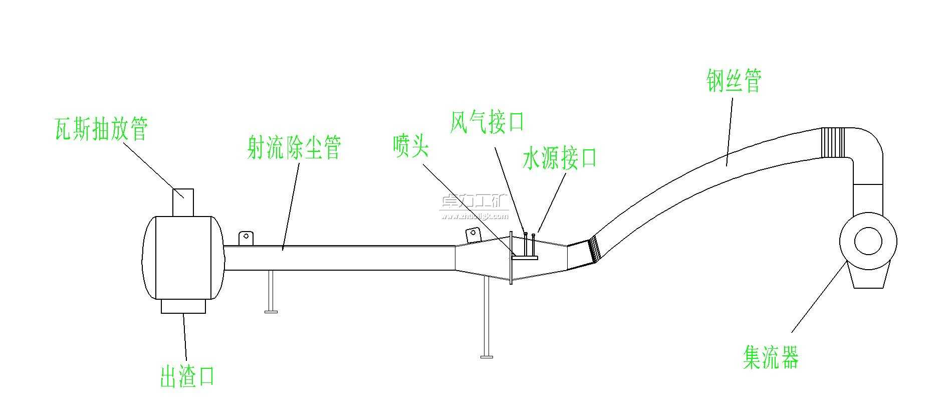 降塵裝置主要由射流除塵管、射流盤、波紋管、集塵器、水氣噴頭等構成。降塵裝置采用噴霧引射流形成的負壓直接將鉆孔煤塵由集塵器吸入引射除塵管,與水霧混合后使煤塵沉降在引射除塵管的內壁,而后被水沖出從而達到除塵的目的。