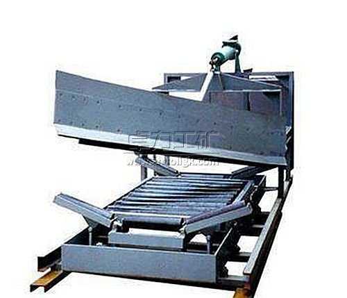 電液動犁式卸料器以電液推桿為動力源,工作時(shí),通過推桿伸出作用于驅(qū)動桿, 帶動框架前進(jìn),完成犁刀下落,并支承起平托輥組,使膠帶工作面平直,犁刀下沿與膠帶面貼合緊密,將運(yùn)行膠帶上的物料卸入漏斗(料斗)中,或卸到需要的場去。卸料完畢時(shí),啟動電液推桿縮回作用于驅(qū)動桿, 帶動框架后退,犁刀上抬,可變槽角托輥組由平形變回槽形,使膠帶工作面恢復(fù)槽形狀態(tài),讓物料平穩(wěn)通過。