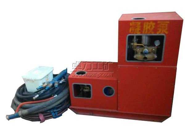 凝膠泵主泵用來輸送已加入促凝劑的水。輔泵用來輸送液態純膠(如水玻璃)。這兩種液料經各自的輸送膠管輸送到混合器中均勻混合后,經三個出液口送出。根據各料的配比不同,這種液態的高水膠料混合液可在30~400秒內形成固態膠體,用于煤礦滅火和防火。