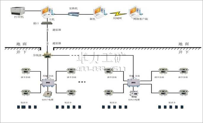 系統采用總線型網絡結構。系統最多可接入16個傳輸分站設備(KJ128A-F型傳輸分站或KJ128A-F(A)礦用本安型傳輸分站);其中KJ128A-F型傳輸分站設備可接入KJ128A-F1讀卡分站1~4個;其中KJ128A-F(A)礦用本安型傳輸分站設備可接入KJ128A-F1(A)礦用本安型讀卡分站1~6個;系統最大可管理標識卡不少于8000;供電電源:KDW17型礦用隔爆兼本安電源;KDW28-18型礦用隔爆兼本安不間斷電源,地面設備使用交流220V供電。