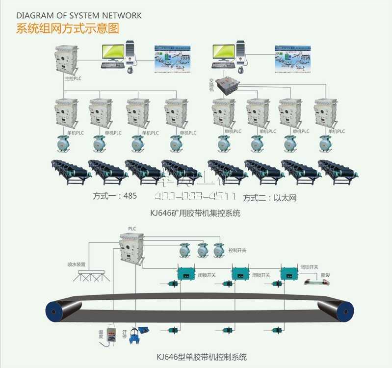 KJ646煤礦用帶式輸送機(jī)電控系統(tǒng)的設(shè)計(jì)是以《煤礦安全規(guī)程》為依據(jù),對煤礦井下實(shí)際情況進(jìn)行考察之后,綜合各方面的要求設(shè)計(jì)出來的,監(jiān)控設(shè)備的種類、數(shù)量、性能符合《煤礦安全規(guī)程》的有關(guān)規(guī)定,適用各類大中小型煤礦。該系統(tǒng)可采集跑偏、閉鎖、撕裂、溫度、煙霧、速度、煤位等性能參數(shù),以及設(shè)備開停等生產(chǎn)參數(shù),可以控制設(shè)備的起動、停止,是煤礦安全生產(chǎn)的必備設(shè)備。