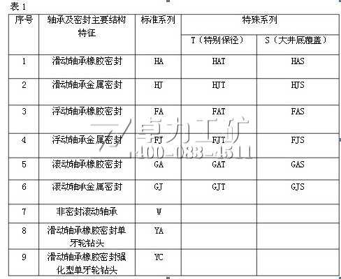 鉆頭系列代號:對于三牙輪鉆頭,按其軸承及密封結(jié)構(gòu)主要特征,分為9個標準系列。除軸承和密封外,鉆產(chǎn)學研結(jié)構(gòu)上比較大的改進作為特殊結(jié)構(gòu),標準系列與特殊結(jié)構(gòu)或特殊結(jié)構(gòu)的組合組成特殊系列。對于單牙輪鉆頭,鉆頭系列代號以“Y×”表示,“Y”指一個牙輪,“×”為設(shè)計編號,代表不同鉆頭設(shè)計特征,江漢鉆頭系列代號見下表1.