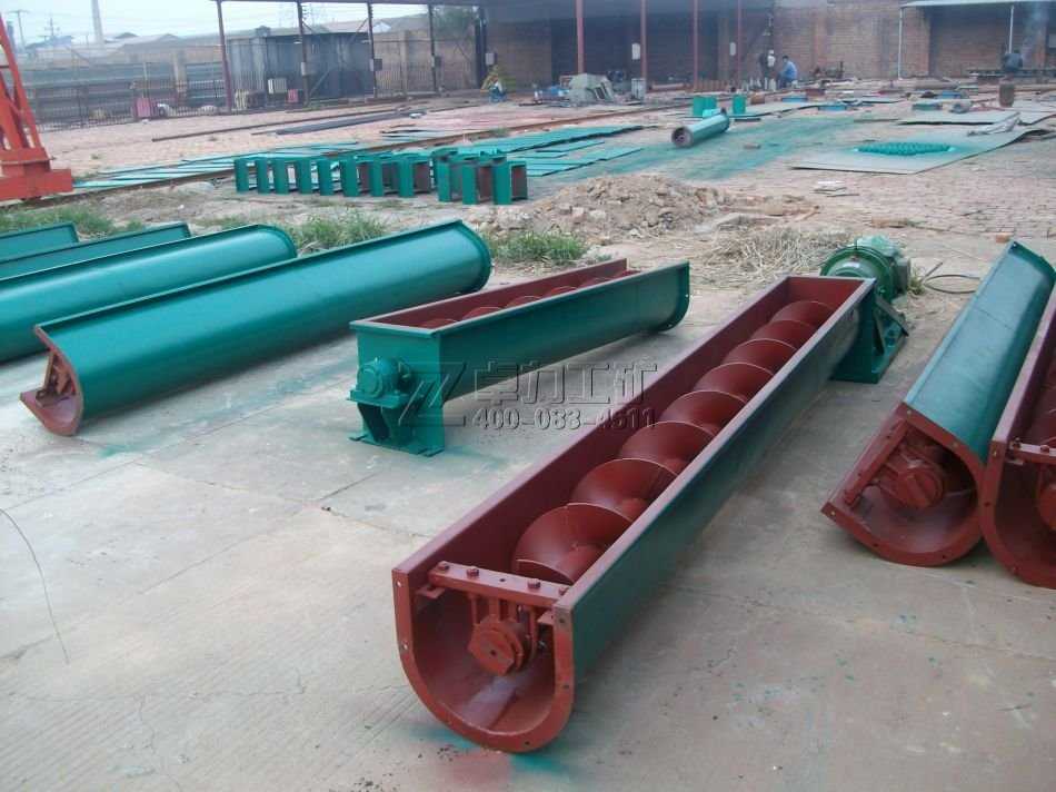 結構特點:螺旋輸送機旋轉軸上焊有螺旋葉片,葉片的面型根據(jù)輸送物料的不同有實體面型、帶式面型、葉片面型等型式。螺旋輸送機的螺旋軸在物料運動方向的終端有止推軸承以隨物料給螺旋的軸向反力,在機長較長時,應加中間吊掛軸承。
