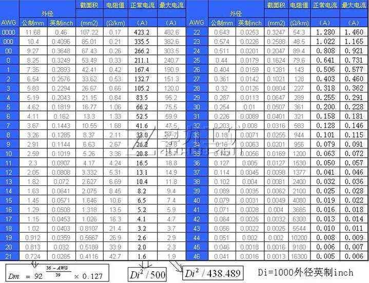 美制電纜規格型號AWG與公制mm、英制單位對照表